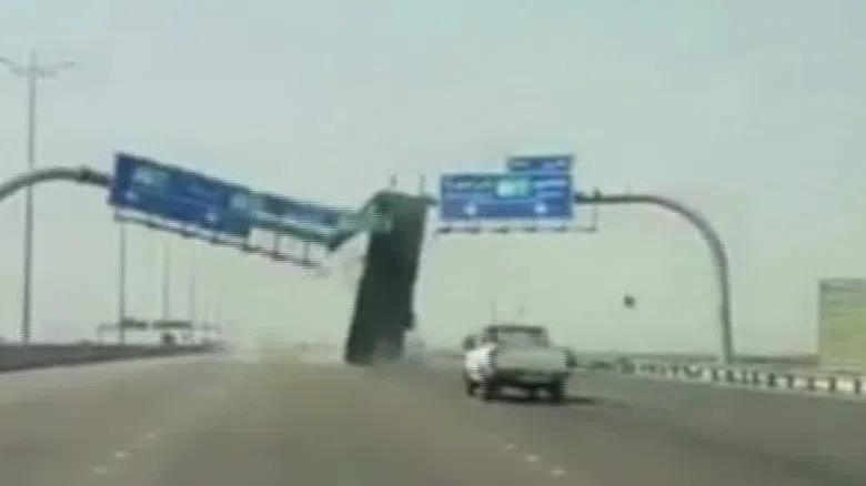 Whoops! Dump truck takes out sign